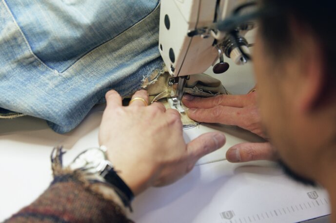 解体が必要な股部分はステッチを外して一度バラし、その他解体が不要な部分も含めてヨコ糸と接着芯を張り、ミシンで叩いていく。特に股部分は既にかなり雑なリペアが施されており、解体はかなりの難関であったが、「一度バラしてから補修して強度を上げた方が永く穿くことができる」という押田さんからのアドバイスもあり、お願いすることにした。