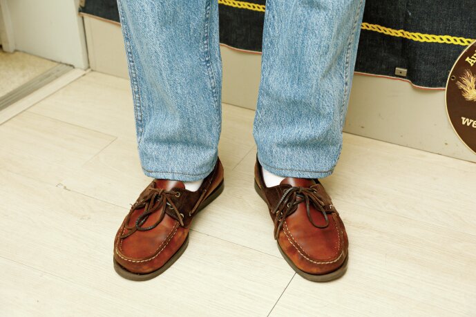 ウエストはピッタリだが、裾がかなり溜まってしまっていたデニムをオリジナルに合わせたチェーンステッチで裾上げ(1700円~)。理想のレングスを手に入れられるだけでなく、穿き込むことで裾の周りにできるアタリも楽しめる。