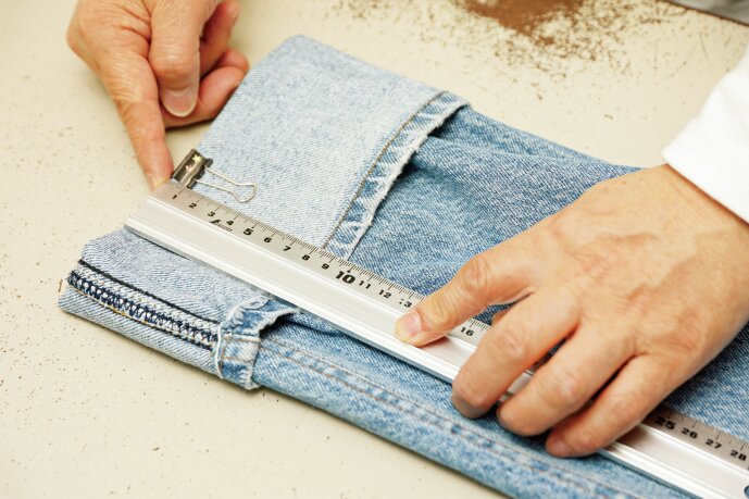 カット位置を決める。この時に裾とステッチとの幅も決めておく。