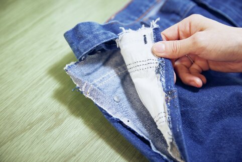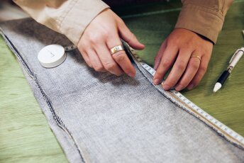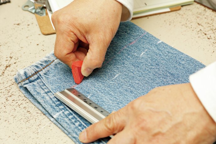裾上げに限らずリペア全般に言えることだが、デニムを持ってくる時は必ず事前に洗濯をすること。古着などの中古品は衛生的な観点に加えて生地の伸びや撚れを戻すためである。また、新品のデニムであっても洗濯をする必要があることは変わらない。汚れがないため意外かもしれないが、洗濯をすることで先に生地を縮めておかないと、裾上げ後に予定寸法より短くなってしまうためだ。