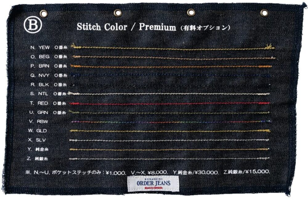 ステッチ色はジーンズのデザインにおいて重要なスパイス。着用時にも見える部分なので、オリジナリティを出すにはもってこいだ。ちなみに、金や銀を練り込んだ糸も特注で用意されている。