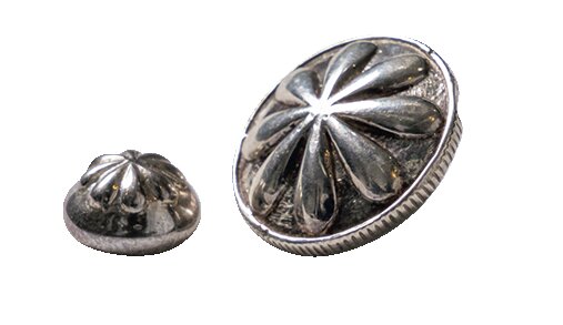 特注で製作したシルバーボタンは価格もプレミアム! その分、1部分だけの使用でも十分迫力が出るので、シルバーアクセサリーなどとの合わせを考えながらワンポイントで取り入れるのもオススメ。ボタンは1個につき1万1000円、リベットは6600円。