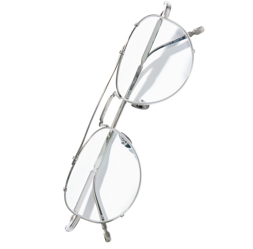 一見、ノーマルなメタルフレームのメガネだが、詳細を見るとリムとブリッジに施された唐草模様の彫金、テンプルの七宝装飾など上下左右どの角度から見ても、繊細なデザインを楽しむことができる。また、メガネの下部に特徴のあるティアドロップながらダブルブリッジ、そのトップバーを留めるための装飾などアクセントが上部に集まっているというユニークなモデル。