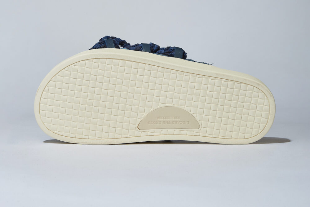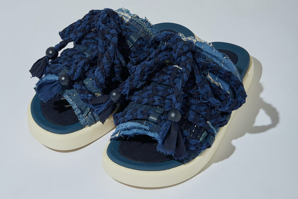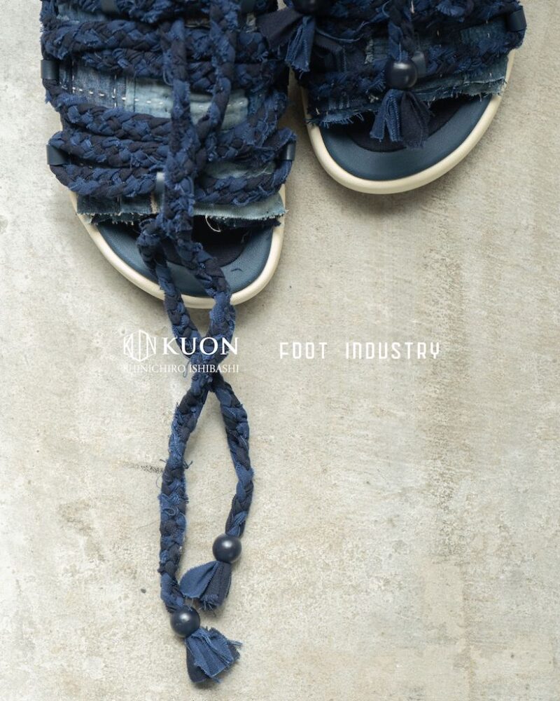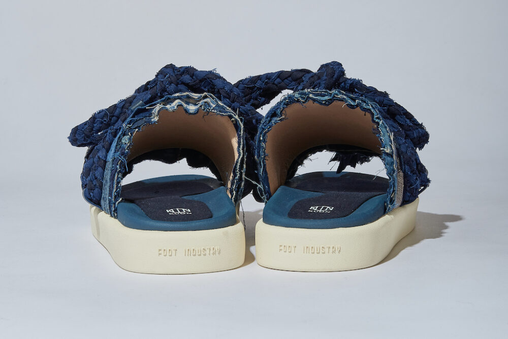 伝統技術へのリスペクトをキーワードに生まれたサンダルは、FOOT INDUSTRYのデザインのなかにKUONが誇る現代版襤褸ファブリックでアレンジした仕上がりに。