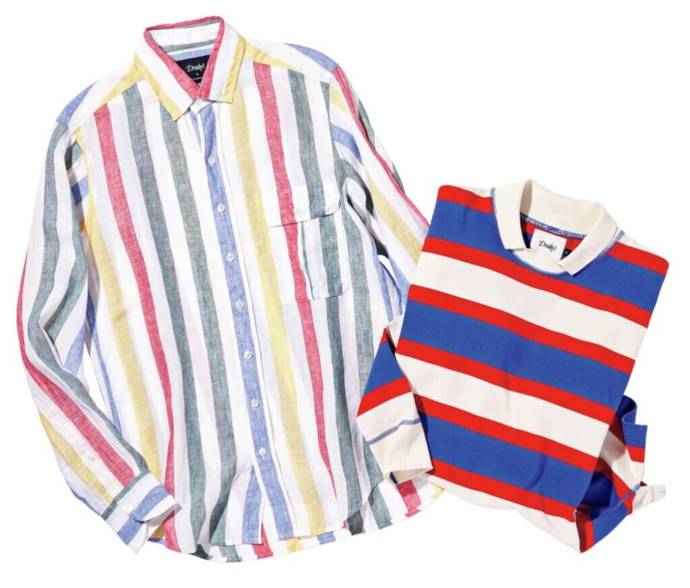 作りの良いエレガントなシャツやタイが魅力である英国の名門「ドレイクス」。実はカジュアルなアイテムも名品で溢れている。サラッとしたマルチストライプのシャツや襟元が特徴的なボーダーカットソーは、ポップでレトロな配色がグッとくる。各3万7400円(シップス インフォメーションセンター TEL0120-444-099 www.shipsltd.co.jp)