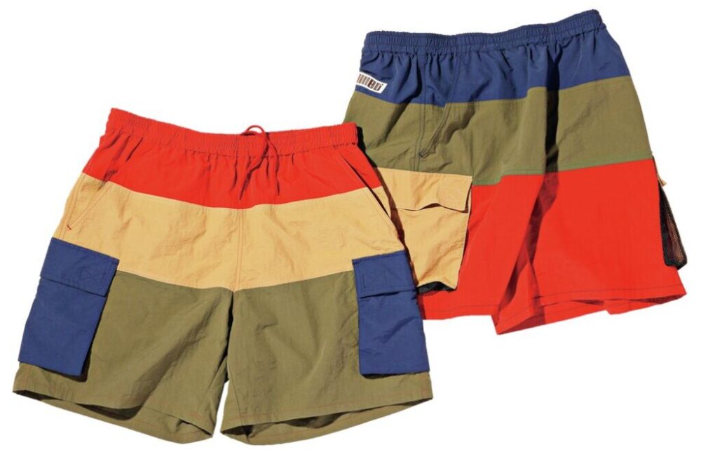 60年代のアウトドアウエアを彷彿とさせるクレイジーな切り替えの配色が目を引くカーゴショーツ。レトロスポーツなムードの配色に、サイドポケットのマチ部分のメッシュ地やウエストのドローコードなどディテールも抜かりなし。2万4200円(ユナイト ナイン TEL03-5464-9976 http://unitenine.jp/brand_info/ill-one-eighty)