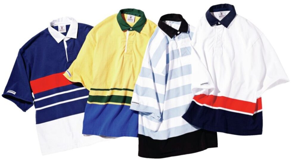 カナダの名門「バーバリアン」と「417 エディフィス」の別注ラグビーシャツはどこか見たことのあるようなデザイン。それもそのはず、フランスやブラジルなど、サッカーの各国代表のユニフォームをイメージしているのだとか。カットオフした袖が絶妙なニュアンスが生み出している。各1万6500円(417 EDIFICE 新宿店 TEL03-5366-0345 https://four-one-seven.jp/)