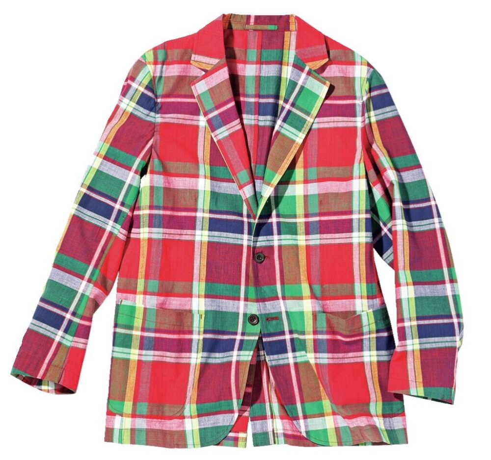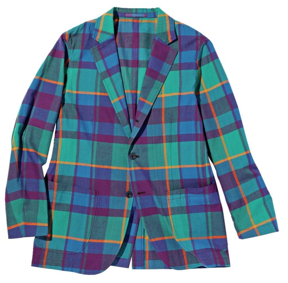 段返り3つボタン、センターベントなど、ザ・アメトラな「D.C.ホワイト」の新作マドラスジャケット。胸ポケットと袖ボタンを廃したややカジュアルなルックスはいまの時期にぴったり。シャツ感覚でサラッと羽織ってほしい。3万6300円(D.C.ホワイト デスク TEL03-6447-5095 https://dcwhite.shop/)