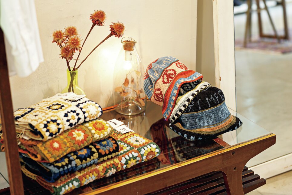 手仕事から生み出される「ストーリー エムエフジー」。スカーフ3万8500円、ハット2万9700円