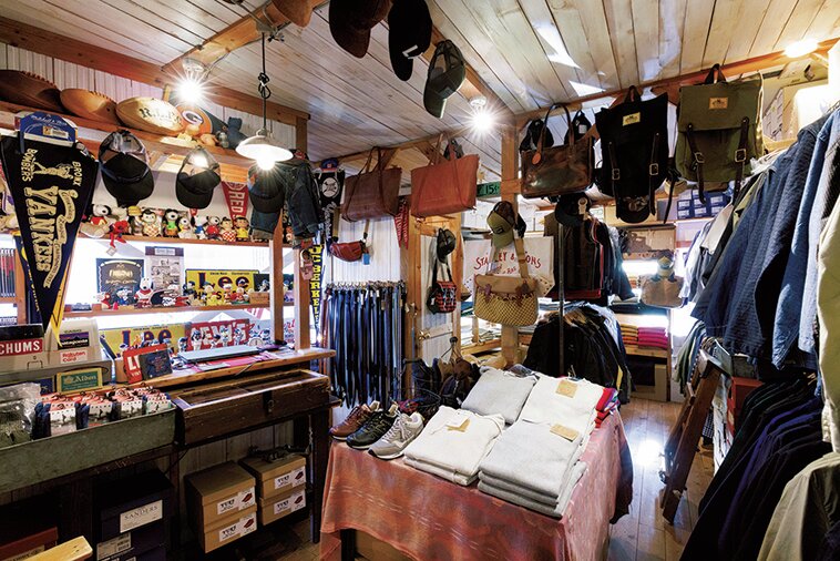 ウッディな店内に所狭しとアイテムや雑貨が並び、旧きよきアメカジショップらしい風景が広がる「トラベルズ」。セレクトもアメカジ中心ではあるが、時代感を汲み取ることに長けたブランドが揃い、ラギッドすぎない点が好印象。スタイリングも、紺ブレをそのままカバーオールに差し替えたかのような、アメトラとアメカジをミックスした得意の合わせ。柄×柄のひと捻りを入れるあたりも、さすが「トラベルズ」だ。