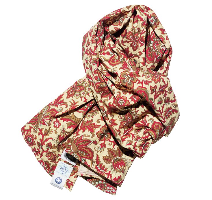 オリエンタルムードのプリントが特徴。「基本は朝晩の温度調整用ですが、Vゾーンが寂しい時にも巻きます。スタイルに合わせて、ストールを変えることも」