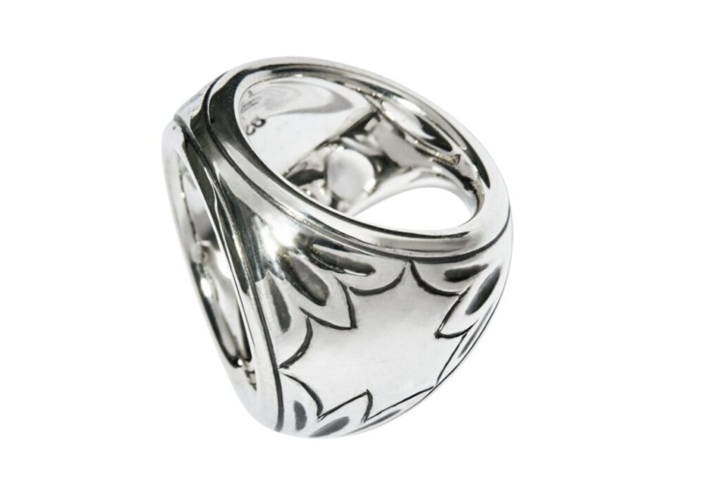 革職人としての顔も持つジュエリー作家・戸田誠氏が2009年にスタートさせたメンズアクセサリーブランド「ロンサム」。彼のモノづくりの根底には“クラシック”があり、このスカーフリングも例外ではない。眩い光沢を放つスターリングシルバーには、由緒正しきアメリカの名門大学「アイビーリーグ」の語源であるアイビー(蔦の一種)などのモチーフが刻印されている。