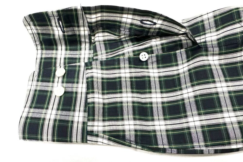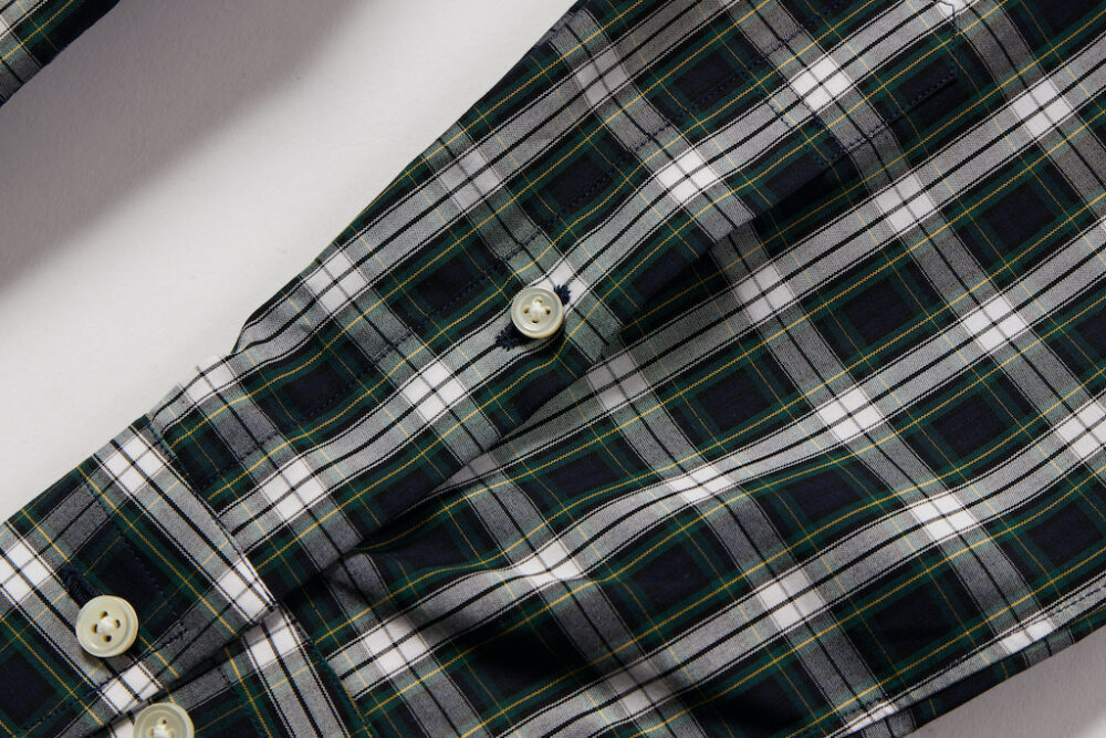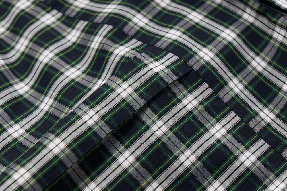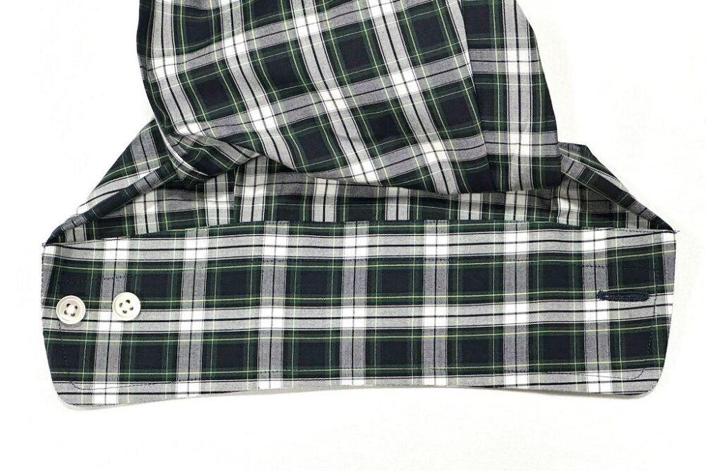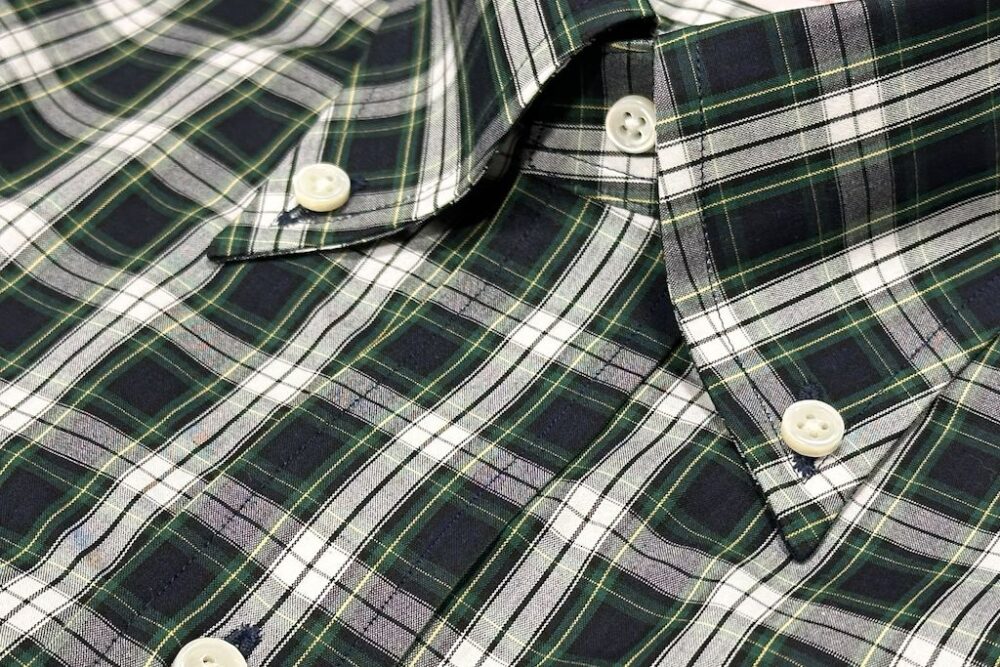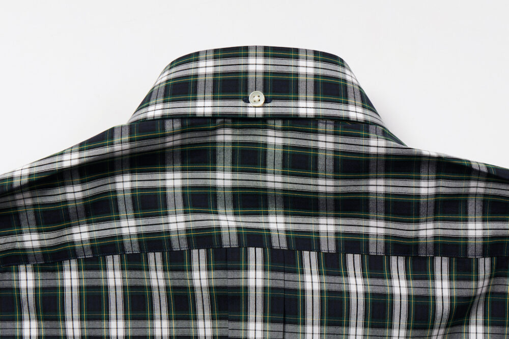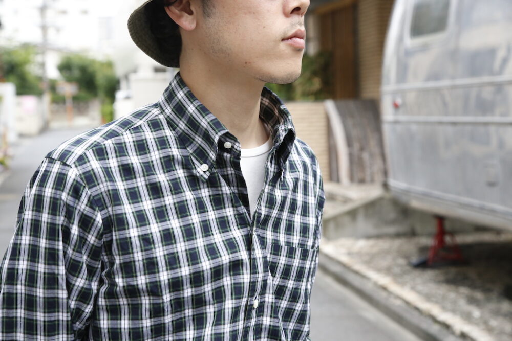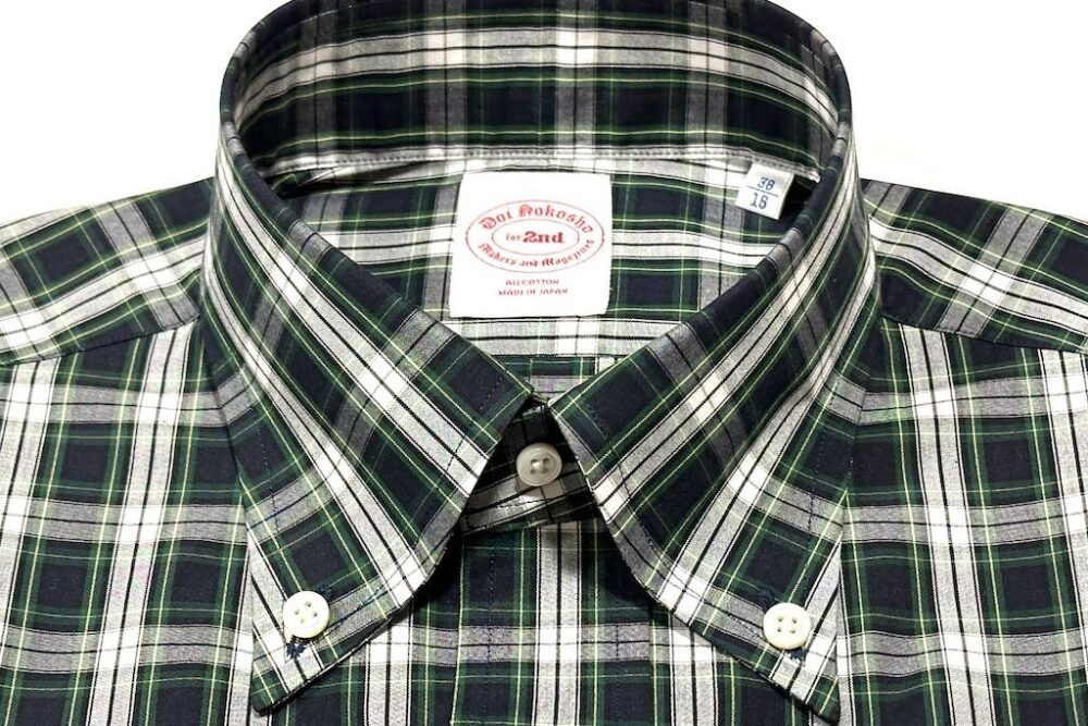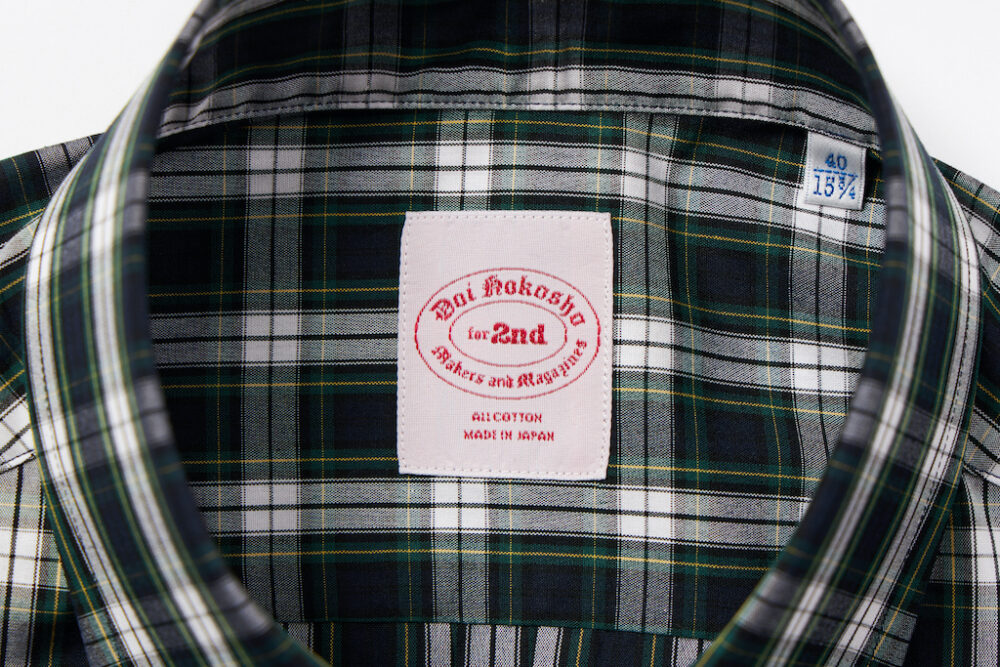 トラッド好きであれば少なくとも2~3枚は持っているB.D.シャツ。今回企画したのは絶妙な胸元の開き具合を生み出す6ボタン仕様、美しい襟のロール、剣ボロ、背面のボックスプリーツ、柄には定番のタータンチェックを採用するなど、2ndが考えるクラシックなディテールを詰め込んだ。