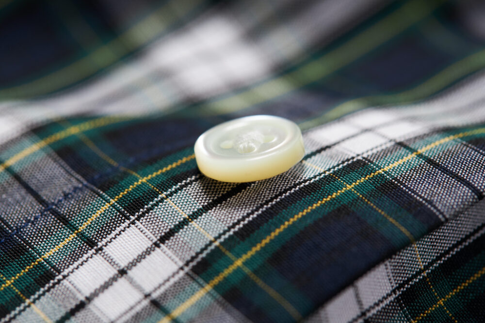 1952年創業の迎えるドレスシャツファクトリーである「土井縫工所」。襟のステッチを見ればよくわかる丁寧なステッチが魅力。3cm間に21針という細かいピッチで運針されており、ステッチはよく見なければわからないほど。高瀬貝を使用するボタンの縫製も感嘆するほどの美しさ。