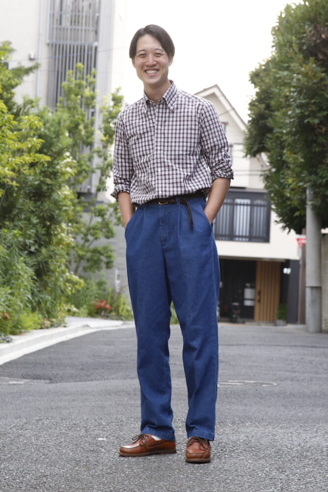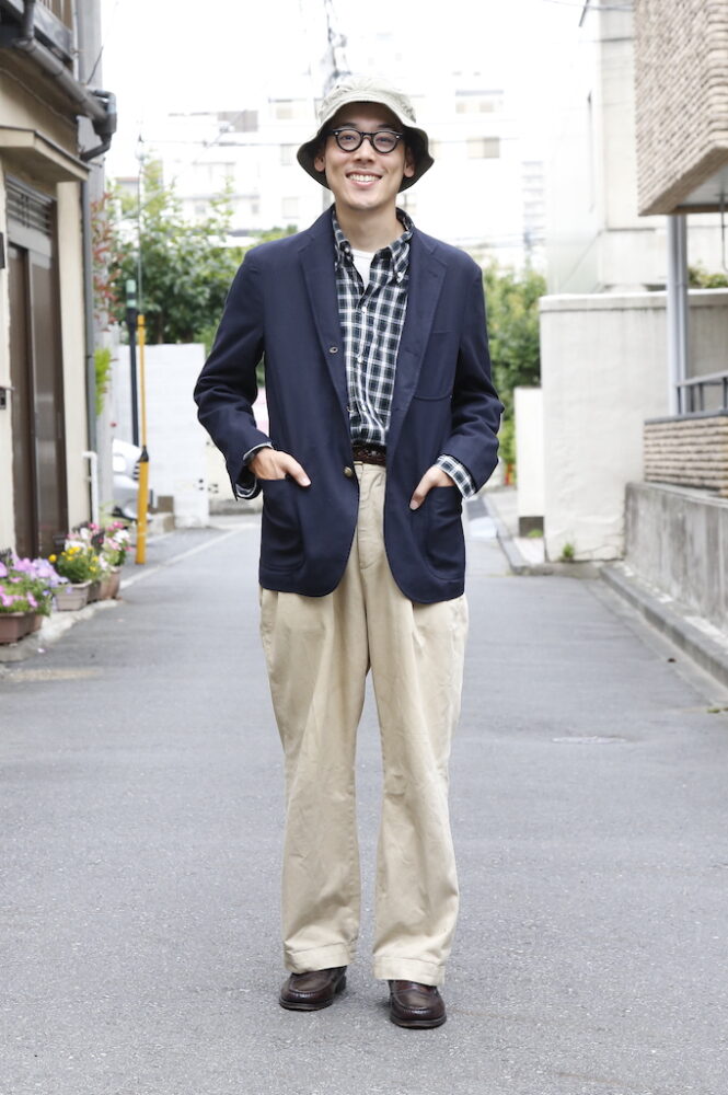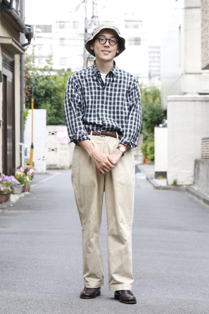 編集部・パピー高野(174cm、50kg、Lサイズ着用)。パピー高野はグリーンのタータンチェックシャツにベージュのチノパンを合わせた、映画『アニー・ホール』のウディ・アレンをオマージュしたスタイルを披露。「このシャツを見た時に真っ先にウディ・アレンが思い浮かびました。6ボタンのため、襟の開き具合も絶妙です。上からブレザーを羽織ってもいいと思います!」