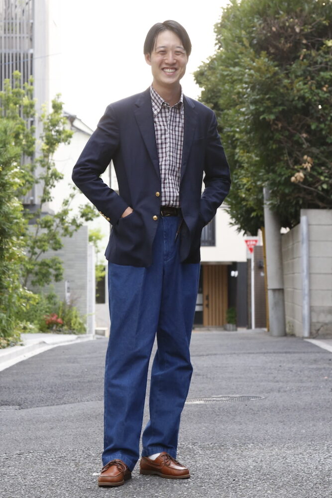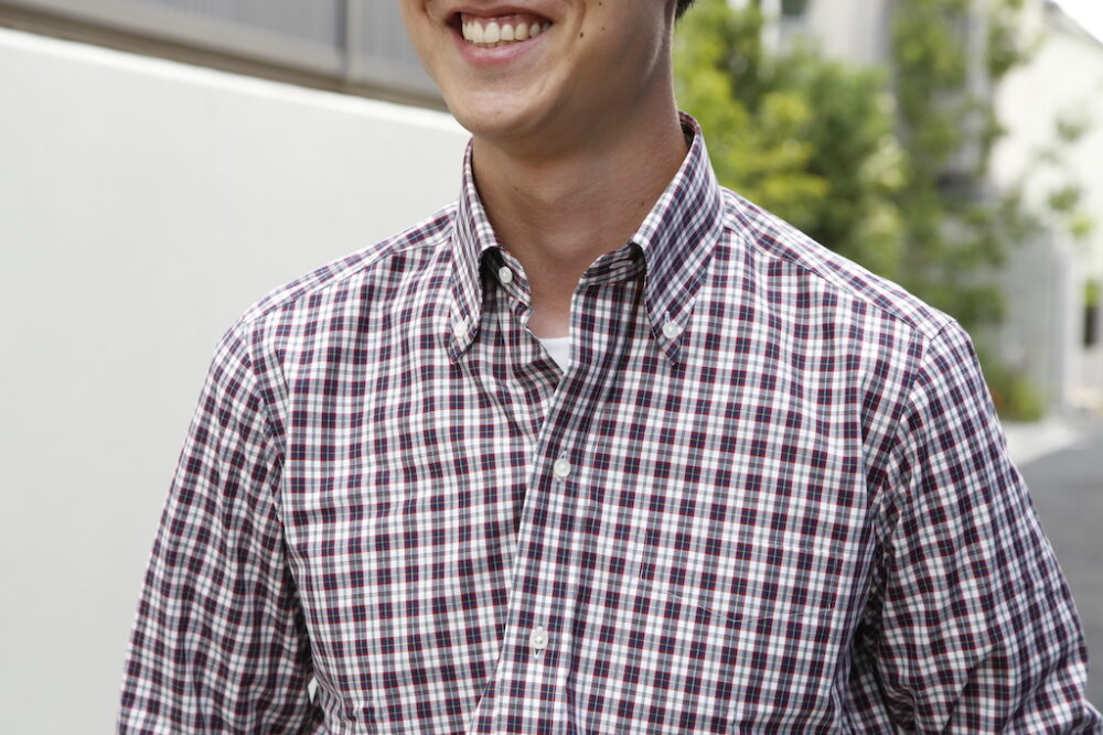 編集部・ミナミ(188cm、72kg、Mサイズ着用)。ミナミは、ややタイトめなフィッティングのネイビー×レッドのMサイズをチョイス。「最近はオーバーサイズを好んで着ていましたが、タイトめのフィッティングも久々にいいかも。ドレスシャツを得意とするファクトリーブランドなだけあって、タイトめでもノンストレスで着られます」