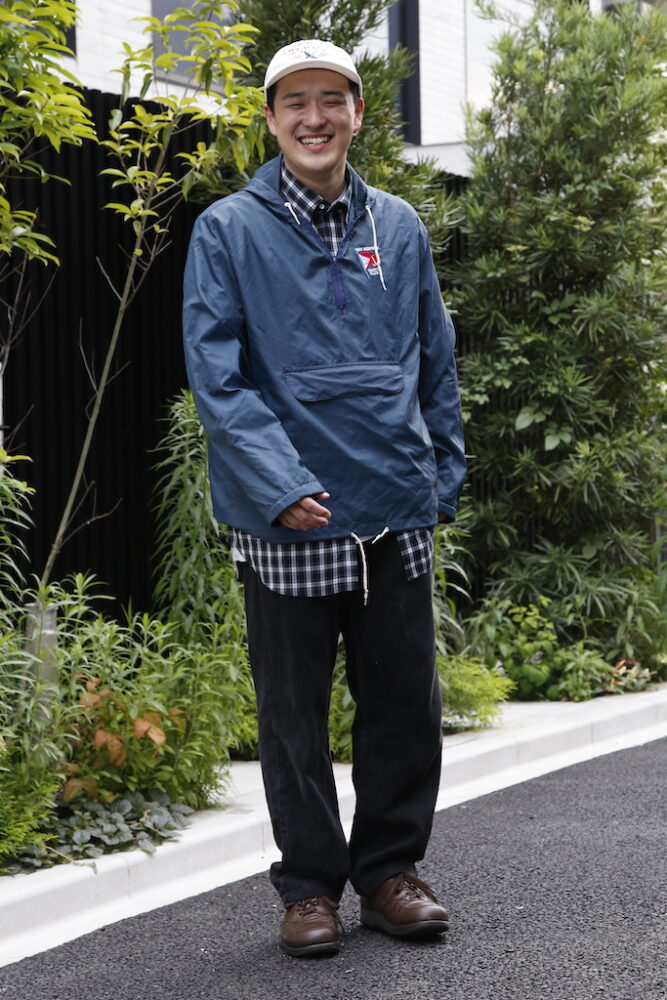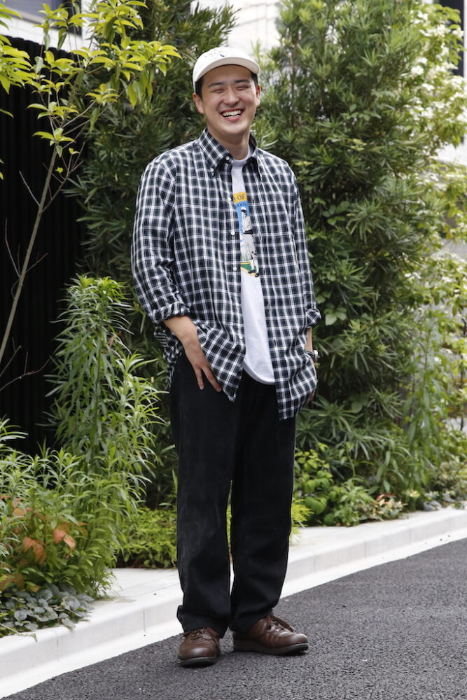 編集部・ナマタメ(169cm、73kg、XLサイズ着用)。古着好きのナマタメはXLサイズを選んで、ややオーバーサイズで着用。「この夏はプリントTシャツの上にシャツを羽織るのにハマっています。カジュアルなスタイルだけど、クラシックなタータンチェックが落ち着いた雰囲気を演出してくれます。スポーティなナイロンジャケットともよく合いますね」