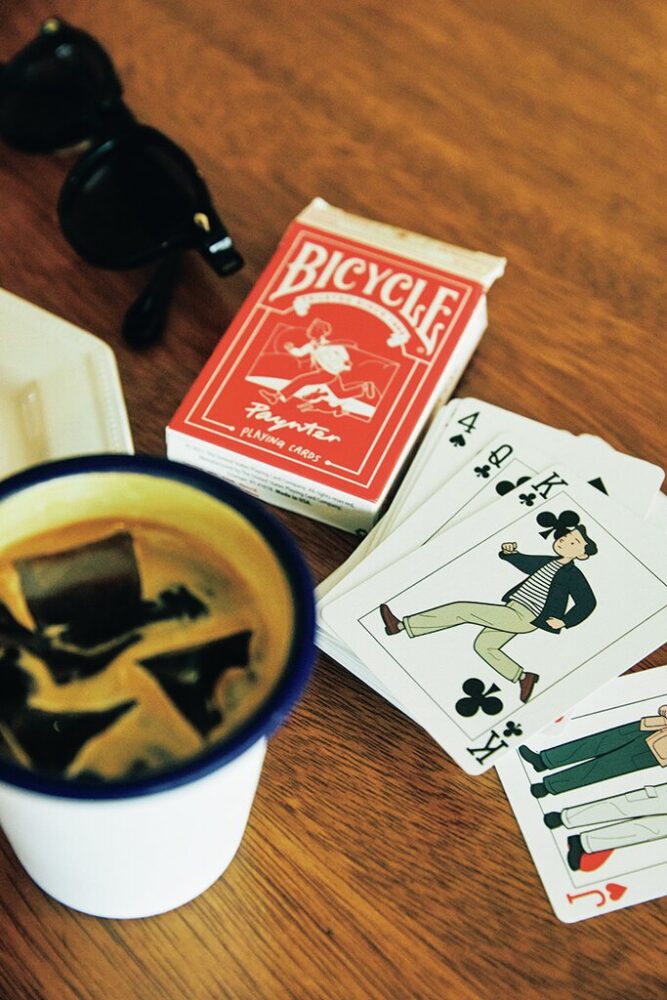取材はアーロンの行きつけであり、彼の知り合いが営む弘大(ホンデ)エリアのカフェ「Hawfinch」にて。トランプは「ペインタージャケット」という英国ブランドとのコラボ作。残念ながらすでに売り切れ。