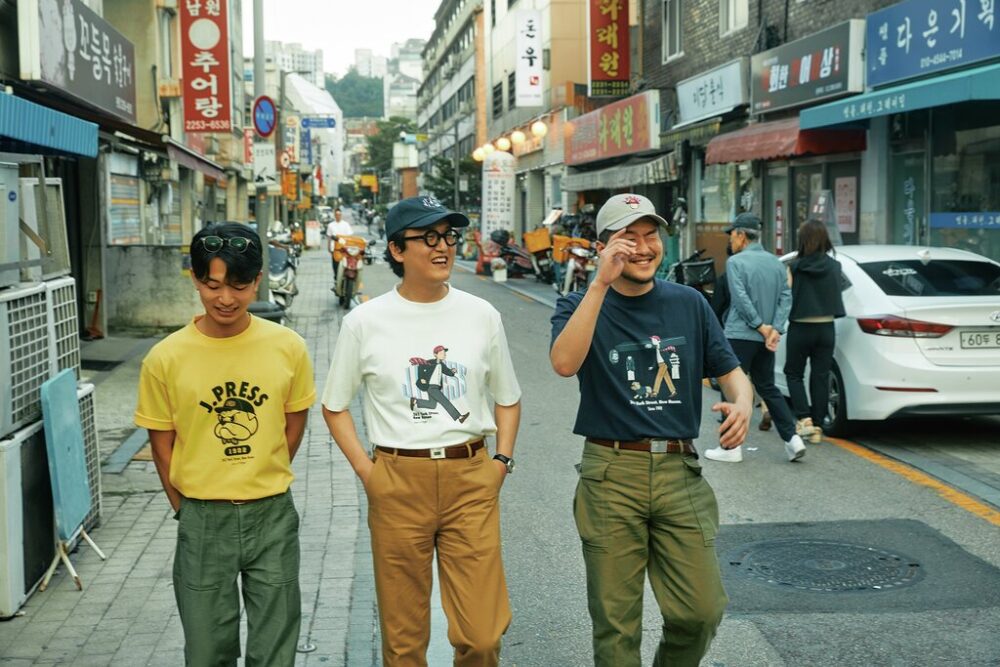 ここは韓国・ソウル。ともに有名な繁華街であるアプクジョンとミョンドンの、ちょうど中心ほどに位置するヤクス駅の近くで撮影された写真だ。中央左が小誌でもお馴染みの「Jプレス」黒野智也さん。中央右が韓国を拠点に世界で活躍するイラストレーター、アーロン・チャンである。