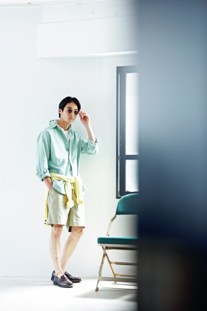 BDシャツ3万800円/ワイス(ユーソニアングッズストアTEL03-5410-1776)、ニットポロシャツ1万7600円/D.C.ホワイト(ステイ オア ゴーTEL03-6447-5095)、チノショーツ2万9700円/シオタcustomerservice@ciota.jp、腰に巻いたセーター1万7600円/マンシングウェア × セプティズ(セプティズTEL03-5481-8651)、ローファー21万5600円/オールデン(ラコタTEL03-3545-3322)