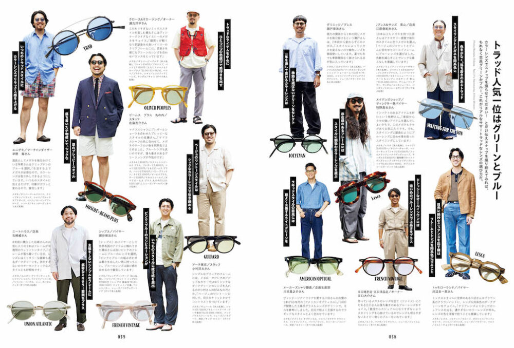 すると面白いことに、ブルーとグリーンの2色に絞られる結果に。フレームとの相性や実用性を鑑みて選ばれたカラーレンズと、コーディネイトへの取り入れ方がわかる、等身大のスナップは参考になる!
