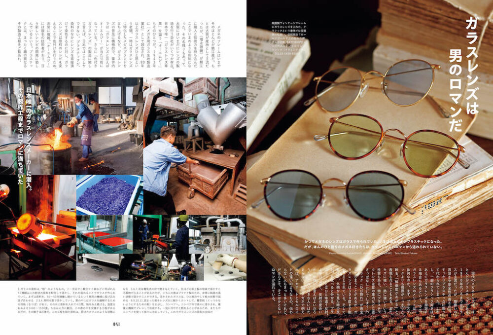プラスチックとは異なる反射の仕方や見え方の違い。そんなマニアックな微差を突き詰めていくことは、ファッション目線でもプロダクツ目線でもこだわり派の醍醐味だ。日本唯一の色付きガラスレンズの製作工程にも迫った、2ndらしいマニアックな企画。メガネ好きなら一読の価値ありと断言。
