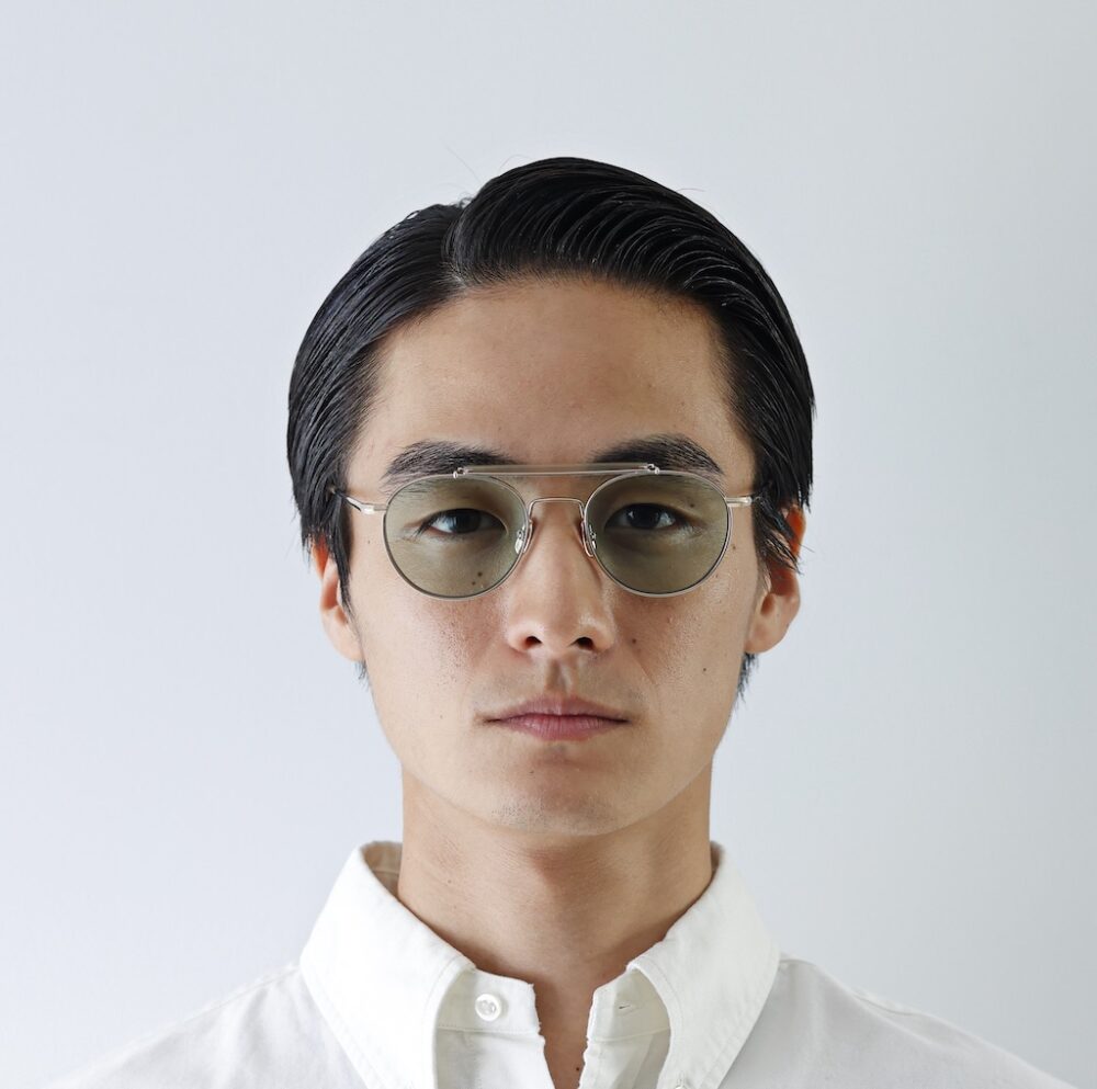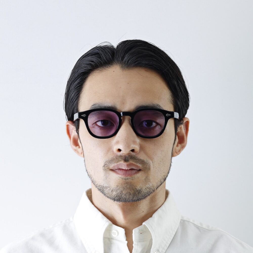 続いて、色味が変わってパープルです。カラーレンズのなかではどちらかと言えば攻めた色。「周りと同じ色は嫌だ!」という人におすすめです。そんなパープルでも、濃度22%程度であれば、違和感なくすんなりかけられることが分かると思います。こちらは「カトハチ」製のレンズになります。