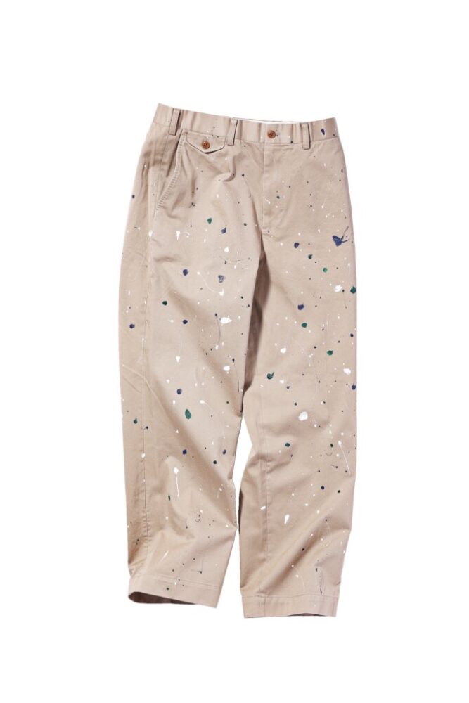 細番手の双糸を用い、高密度に織られたウエポン生地に、国内の職人によるハンドペイントを施したインパクトある1本。生地の光沢やペイントワークを活かすべくウエストはノータック仕様。あるアーティストが履くチノパンにキャンバスやパレットから弾けた塗料が付着した、というストーリーが込められているのだとか。2万2000円(D.C.ホワイト デスク TEL03-6447-5095 https://dcwhite.shop/)