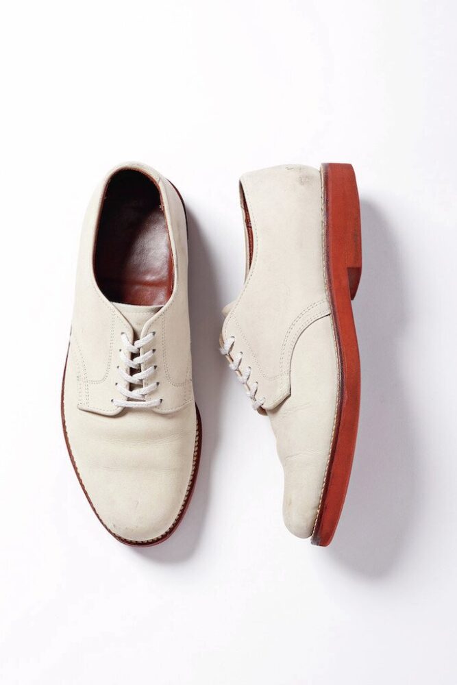 よりコアなアイビーファンであるほど欠かせない必需品が、バックスシューズ。本来はバックスキン(鹿革)が用いられていたが、現在ではヌバックが主流。なかでもレンガソールの赤土色とアッパーの白色の組み合わせがアイコニックなホワイトバックスは、アイビー好きからの絶大な支持を得る。