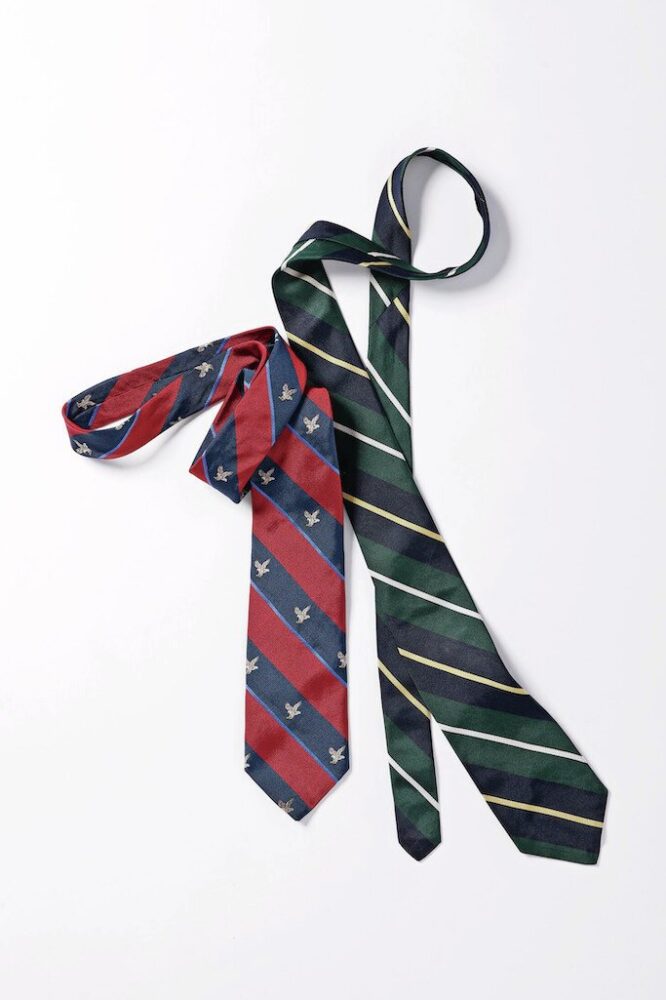 「革靴を履くスタイルとトラッドなタイの相性は言うまでもありません。いまでも店頭に立つ時は、ブレザーにレジメンタルタイを締めるのがマイルールです。コーディネイトに応じてイーグルのモチーフが入ったクレストとシンプルなストライプを使い分けています。