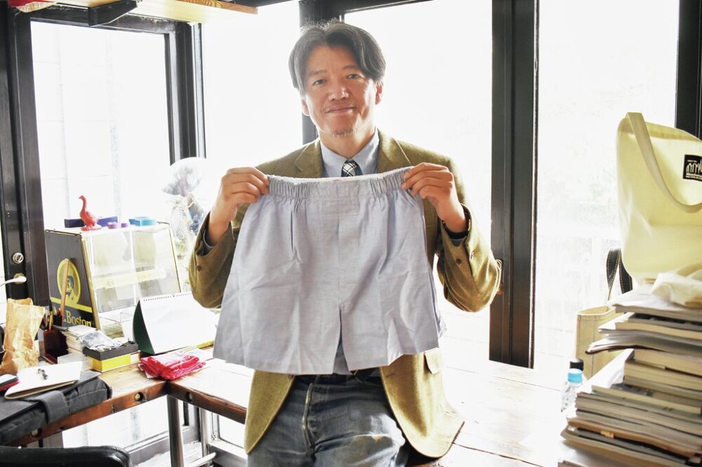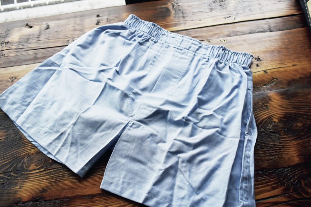 坂田さんの裏名品はなんとアンダーウエア! 5月〜9月の暑い時期はもっぱらボクサーショーツ派だという。「元々オックスフォードシャツが好きなのですが、個人的に白は爽やかすぎるので、ブルーのオックスフォードがワードローブに多いんです。そこで『ブルーのシャツにブルーのショーツは洒落てるな』と思ってから長年愛用しています。