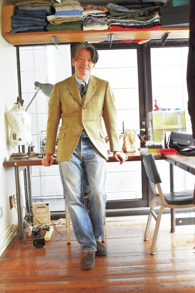 個人的に坂田さんのコーディネイトのファンなので、全身スナップをパシャリ。英国的なチェックジャケットが素敵です! .この日着用していたシャツもブルーのオックスフォードシャツ。