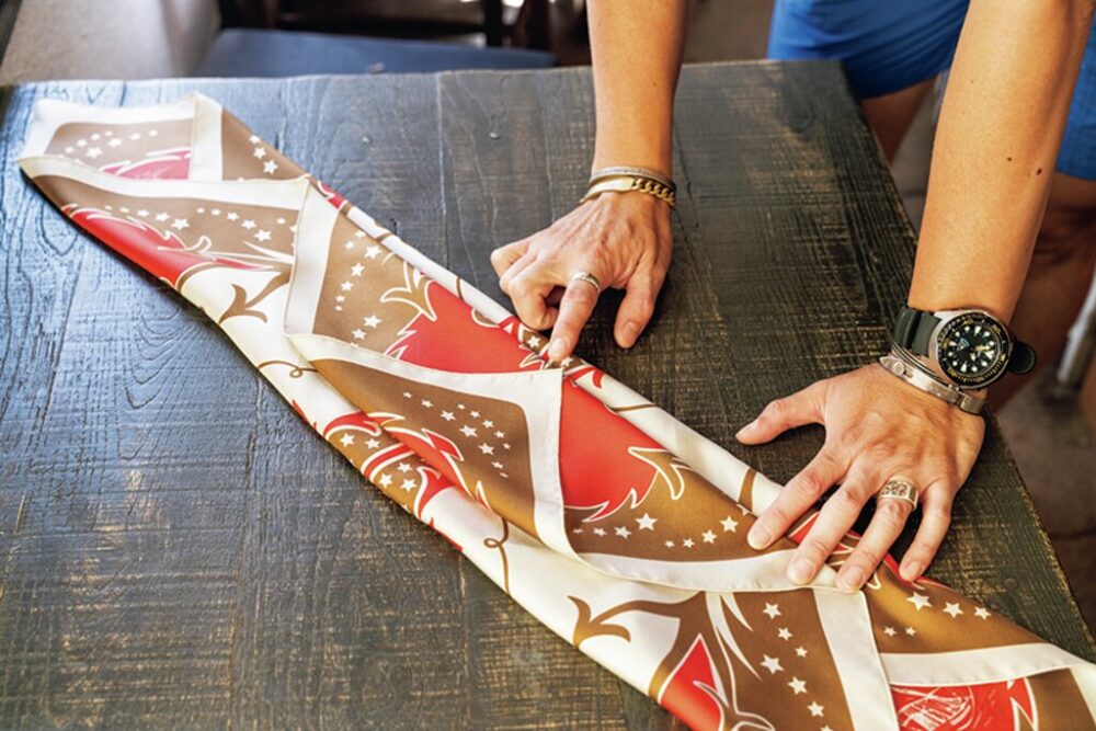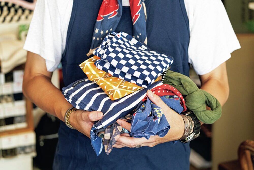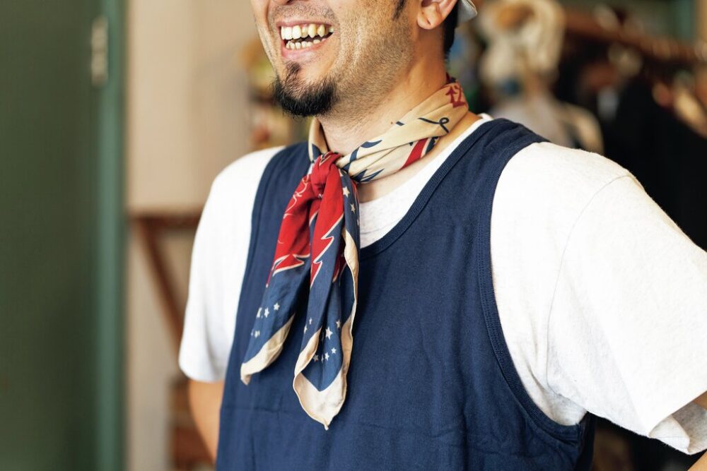 大手メゾンのOEMも請け負うフランスブランド「ピースオブシック」のシルクスカーフは、アンカー(錨)や海のプリントが入ったデザインと程よい光沢が特徴。コーディネイトにスカーフを取り入れることの多い小野さんにとって、アメトラの定番・BDシャツに合わせるのはタイよりもスカーフの方が理にかなっているのだという。