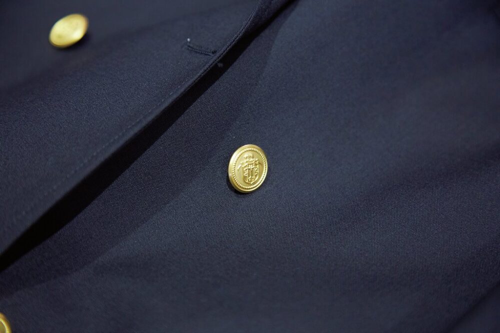 写真上/黒野さんおすすめのインナーは、「ルミノア」のデッドストック生地を使ったバスクシャツ。フレンチトラッド風味の合わせを好んでいる。写真中/ボタンは「Jプレス」らしいクレスト。写真下/ダブルブレザーと言えばサイドベンツ。いまの気分はシングルよりダブルとのこと。