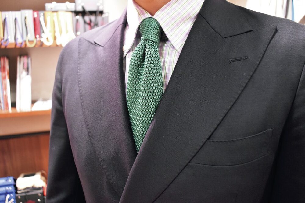 「レジメンタルタイのような一般的なタイと比べても、ニットタイは程よい抜け感があり、ジャケットスタイルを気崩すには持ってこい。色を入れることでVゾーンに“遊び”を加えるのにも最適である。生地も肉厚で耐久性も高く、カラバリも豊富。