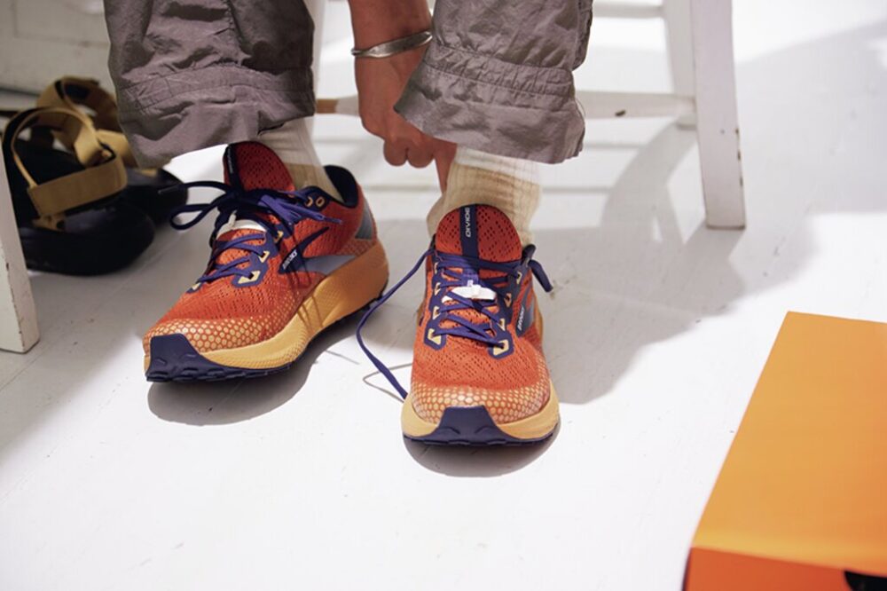 写真上/バックポケットはこんな感じ。ブレザーと合わせるイメージで購入したそう。写真中/サイズはレギュラースモール。写真下/「ずっとトレランやってて、これも裏名品だよ」と教えてくれた〈ブルックス〉の[ディバイド3]