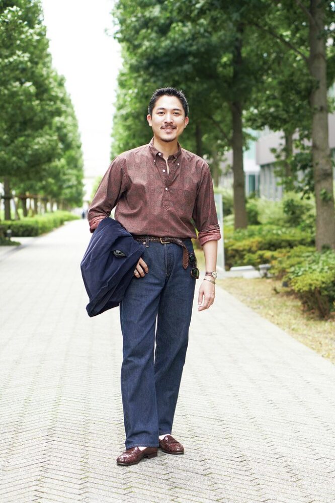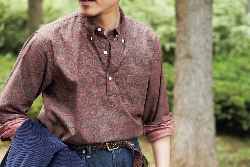 リアルなアイビーカルチャーをふんだんに詰め込んだという〈鎌倉シャツ〉の「ヴィンテージ アイビー コレクション」。庄子さんオススメは細かなバティック柄が施された1枚。「1950〜60年代のリアルなアイビーリーガーたちが着ていたであろうシャツをイメージして作ったんです。シルエットや3つボタンなど、当時のディテールはもちろんなのですが、1番のこだわりはその作り方なんです。