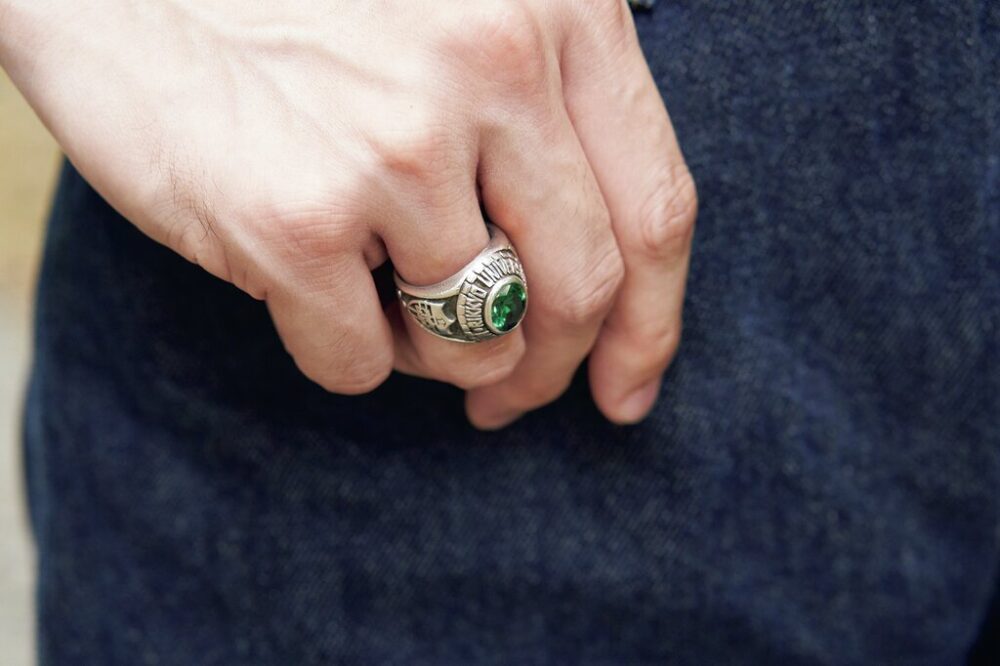 写真上/サイズ感、色使いなどスタイリングは流石です! 写真中/シャツの捲り方が格好良すぎたので撮らせてもらいました、僕も真似していいですか? 写真下/大学を卒業した時に作ったというカレッジリング。アイビーカルチャーが大好きな気持ちが伝わってきますね。