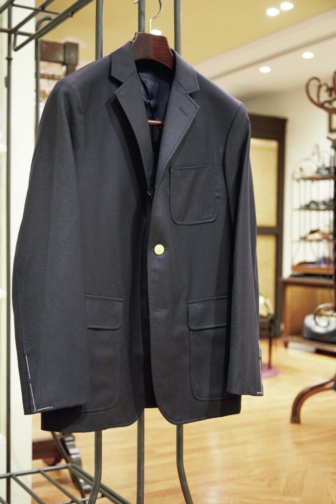 「丸の内店がオープンした2007年から17年間続いているラインで、60年代前半にアメリカに存在した定番的なスポーツコートの形をベースにしています。製作をお願いしているのは、神戸のテーラー「ジジ」。「ジジ」さんのパターンは絶妙で、包み込むようなシルエットが自慢。ナチュラルショルダーにフックベント、そして60年代特有のボタン感覚の広さなど、定番仕様はしっかり踏襲しつつ、ラペルはナローに仕上げています。