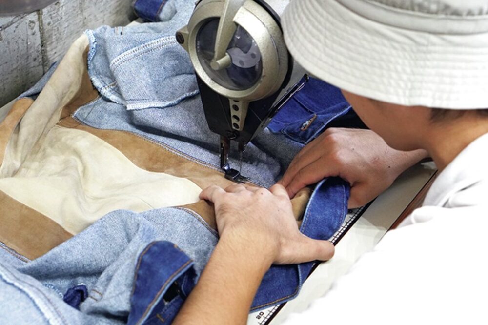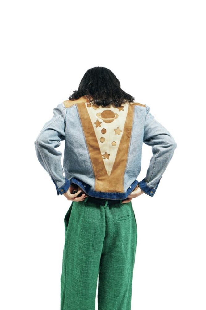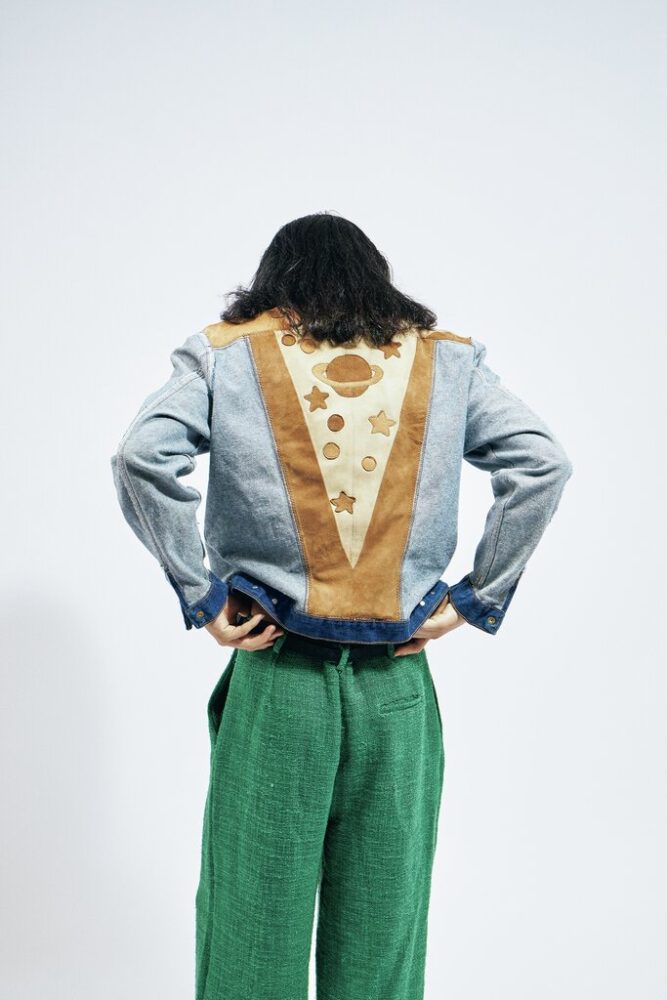 持ち込まれたラングラーのデニムジャケットにメスを入れて、着る面によって印象が変わる一石二鳥なジャケットが完成! 裏で着た時のセンターにレザーを貼りフェイクボタンをつけることでより自然に仕上がった。