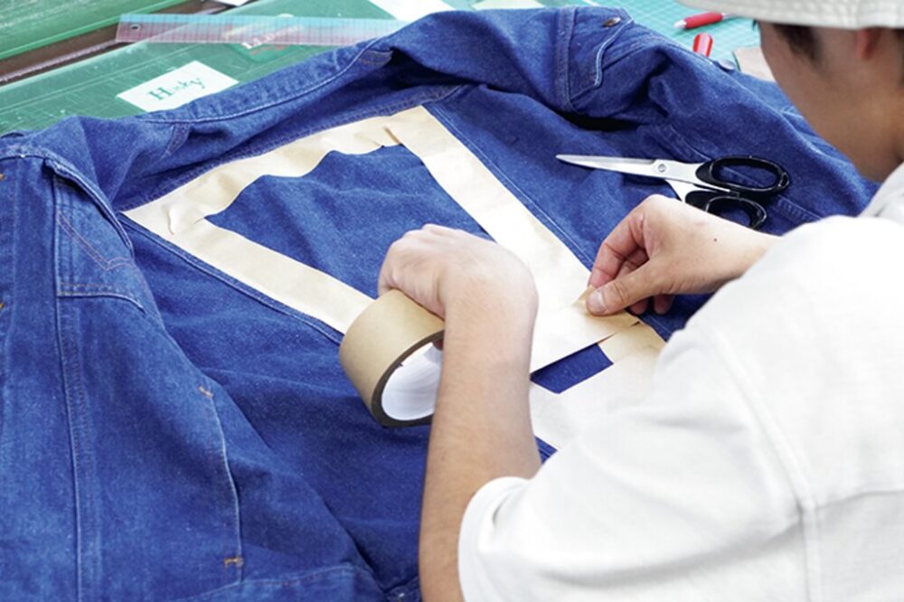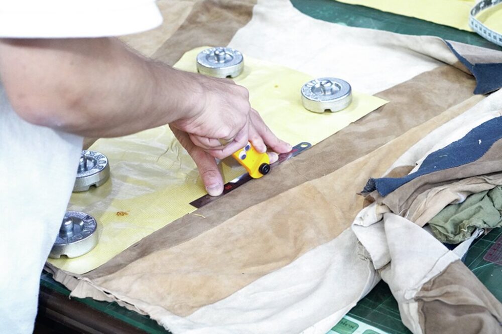 レザージャケットに型紙を当て、合わせる柄を確認しながらカッティング。