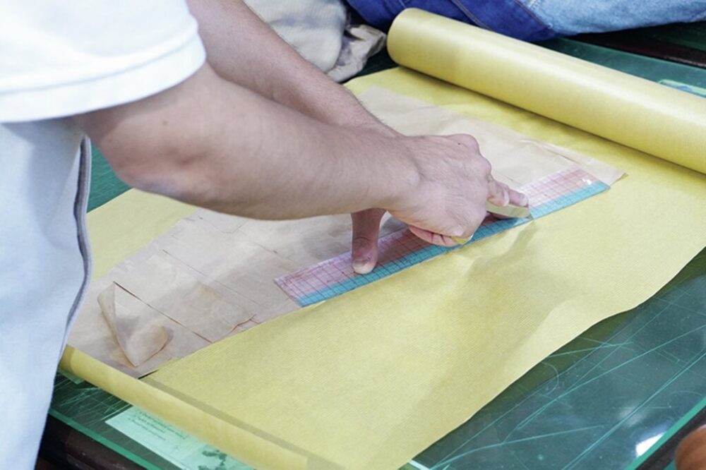 剥がしたテープを紙に乗せ、切っていく。他の部位も同様に型紙を作る。