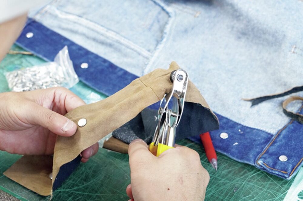 裏側の前縦には縫い付ける前にフェイクのスナップボタンを取り付ける。