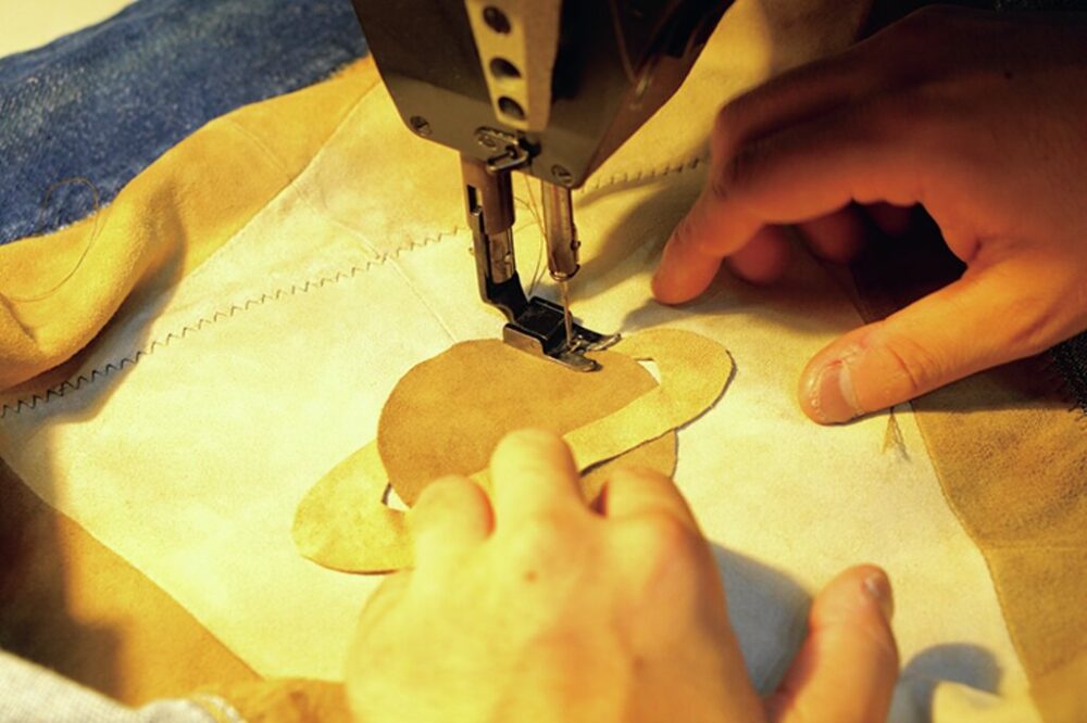 背中や肩部分のレザーを縫い付けていく。柔らかいレザーはヨレ注意。