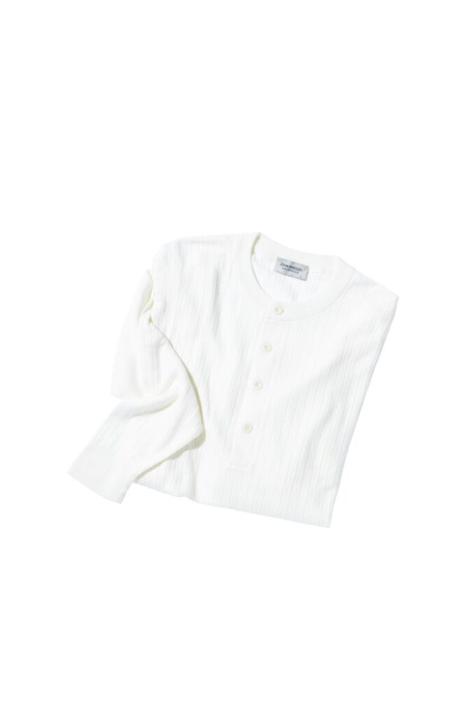 1784年の創業以来、イングランド東部のミッドランズ地方のファクトリーでの生産を続けるニットメーカー「ジョン スメドレー」。ファインゲージニット=編み目が細かく精密に編まれたニットといえば、真っ先に思い浮かぶほど、名実ともに世界をリードしてきたヘリテージブランドから、オーセンティックなヘンリーネックの登場だ。スポーティーな印象のあるヘンリーネックも30ゲージのリブ編みによって、エレガンス漂う上品なムードを醸し出し、さらに肩幅や身幅のサイジングを程よくゆとりを持たせることで現代的なフィッティングに。しっかりと目の詰まった首元と袖のリブは、1枚で着用した時の存在感はさることながら、インナーとしても活躍すること間違いなし。そして、上質なニットウエアでしか感じることのできない極上の着心地は、あなたを虜にすることを約束する。6万2700円(リーミルズ エージェンシー TEL03-5784-1238)