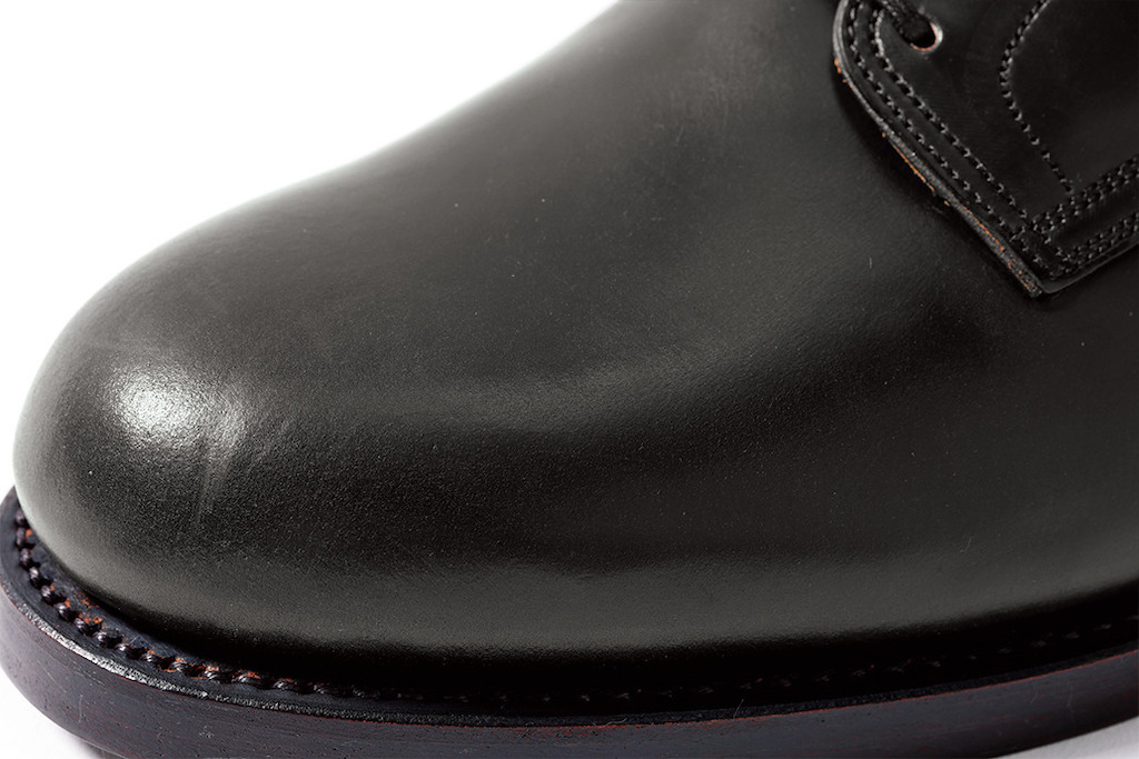 履き込むこと でマットな質感とコードバン特有のツヤが入り交じるだけでなく、コードバンの芯は茶色なので、墨染めが色褪せると、一般的なコードバンとはひと味違うエイジングを楽しめる。