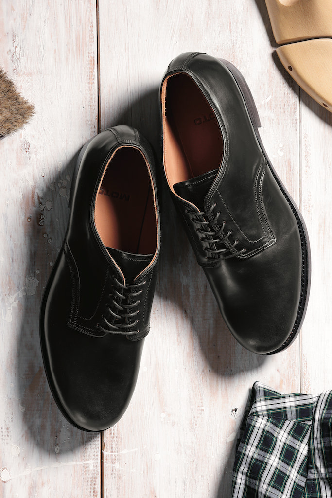このモデルは国内屈指のレザーブランド「モト」とタッグを組み、たどり着いたのは“墨染めコードバン”。ご存知、馬の臀部の皮革にあたり、「革の王様」とも呼ばれるコードバンというだけでも革靴好きにとってはテンションが上がるけど、それだけではないのがポイント。