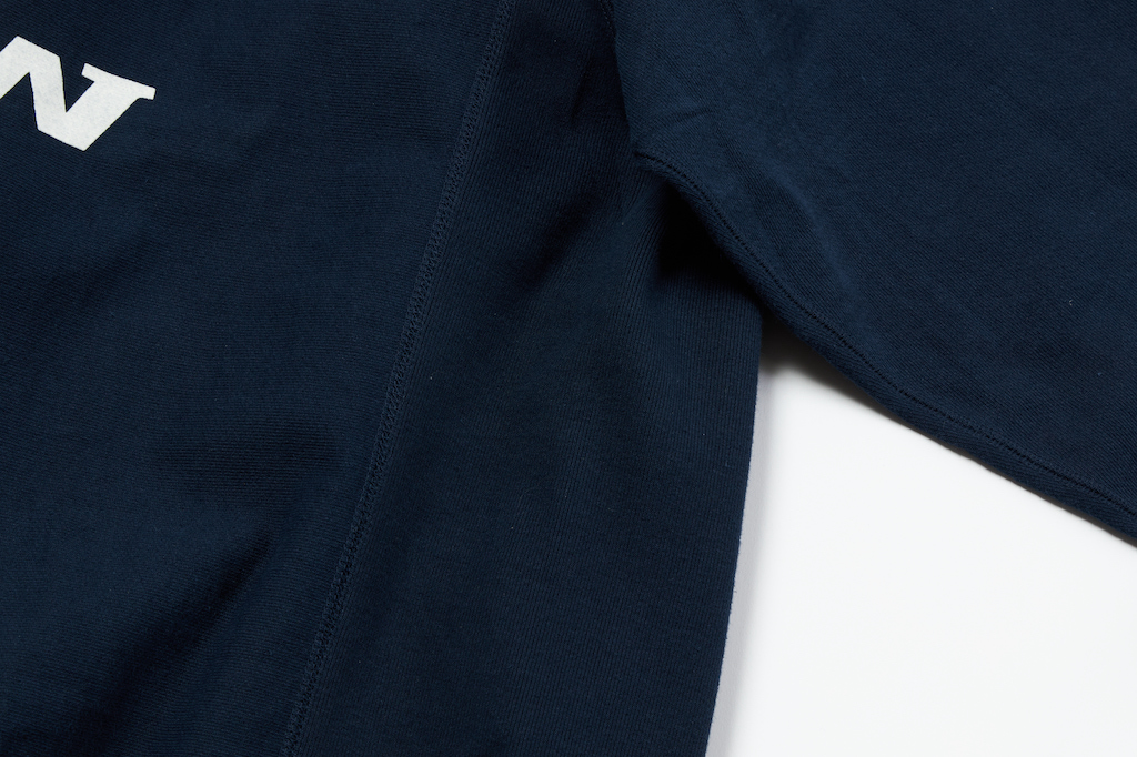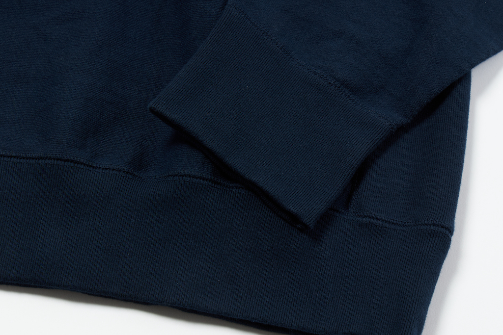 ステッチをよく見ると、特殊なミシンを使った四本針のフラットシーマに。これは、縫い目がフラットになり、昔ながらのアンダーウエアにも採用される肌に触れるストレスを軽減する縫製。また、袖と裾部分のリブもポイント。16オンスの肉厚なボディと同様に、しっかりと生地の詰まったリブもスウェット好きには嬉しいポイントだ。