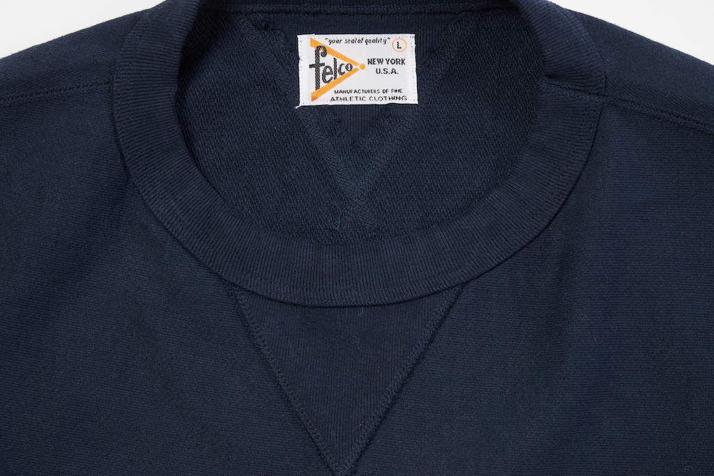 首元は、一般的に1930~50年代のスウェットによく見られた両V仕様。表裏の両面にV字ガゼットの入るデザインは、ヴィンテージ好きにはもはや説明不要のクラシックなディテール。このV字ガゼットは、生地の縮み防止や、汗止めのためのディテールとして存在したと言われ、後年になると省略されていった歴史がある。