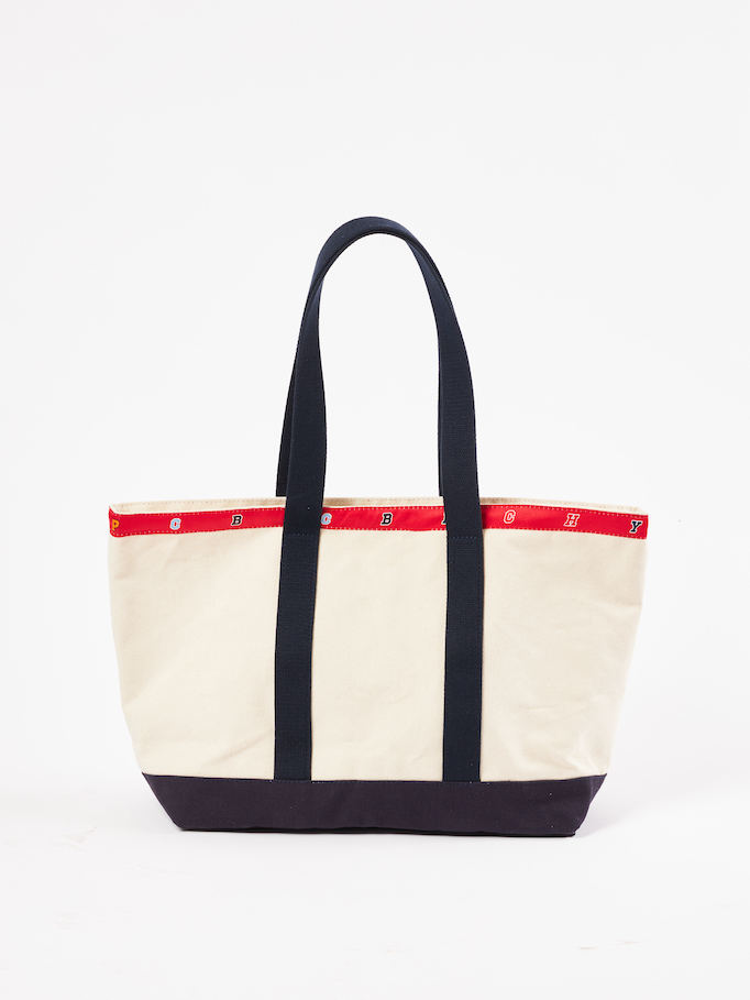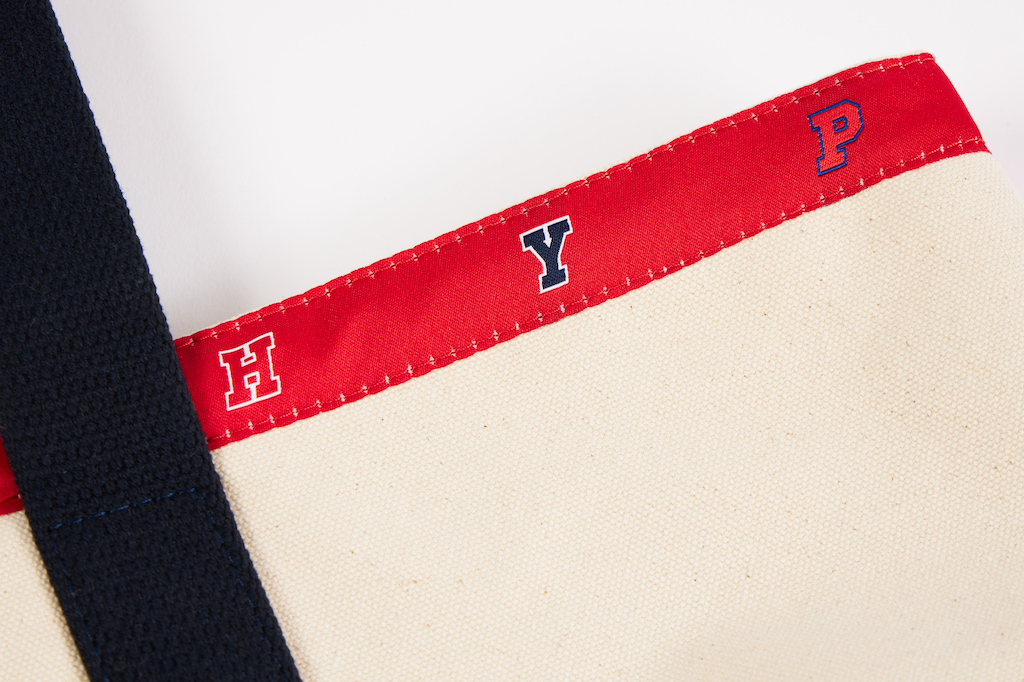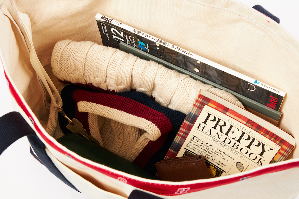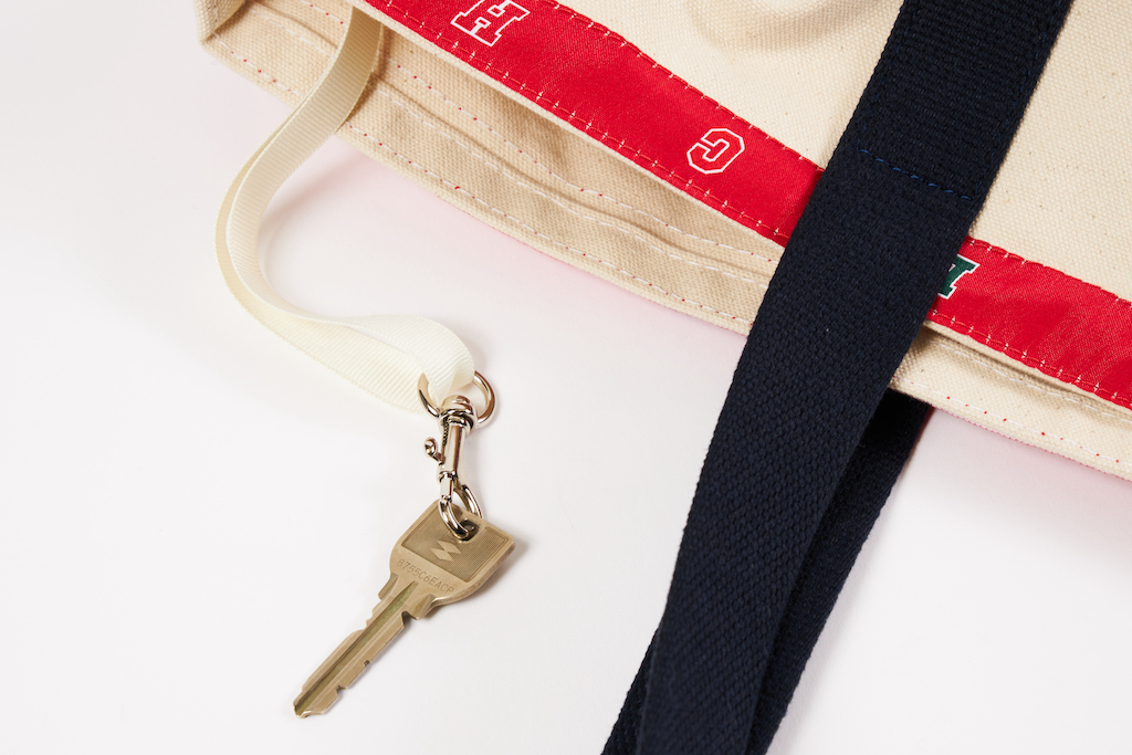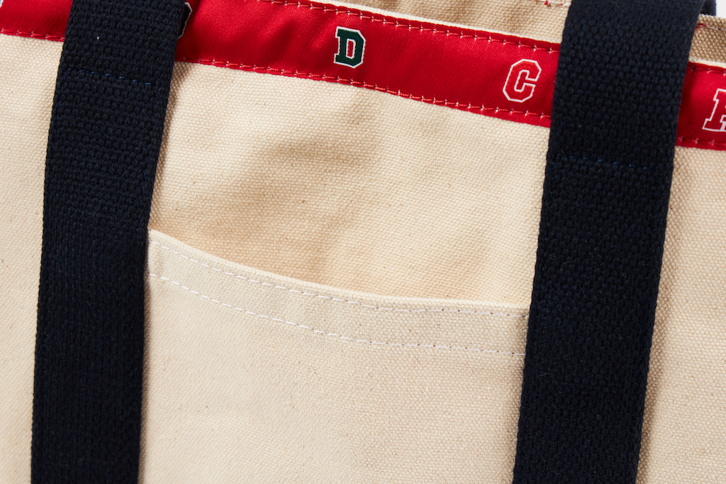 オリジナルテープのデザインは、アルファベット8つから構成。これはアイビーリーグ8校の頭文字を創立順に並べている。そして、それぞれを構成するカラーリングも各校のスクールカラーをイメージした配色に。日本においてアイビーやプレッピー、ひいては「アメトラ」が定着したのは、その発信源であるアイビーリーグ8校があってこそ。それらへの憧憬こそが、アメトラ興隆への原動力となったことに敬意を表し「アイビートート」とネーミングした。